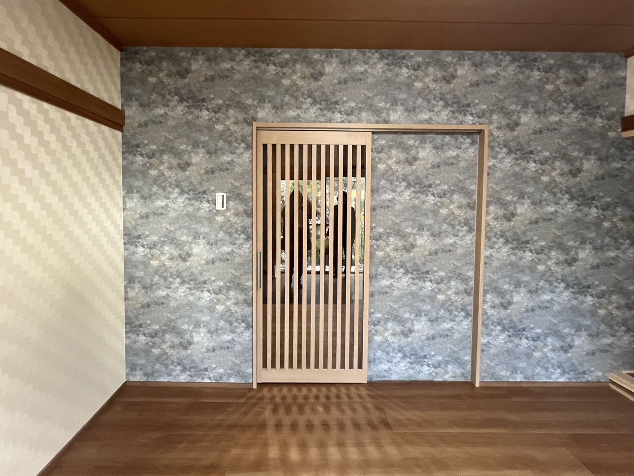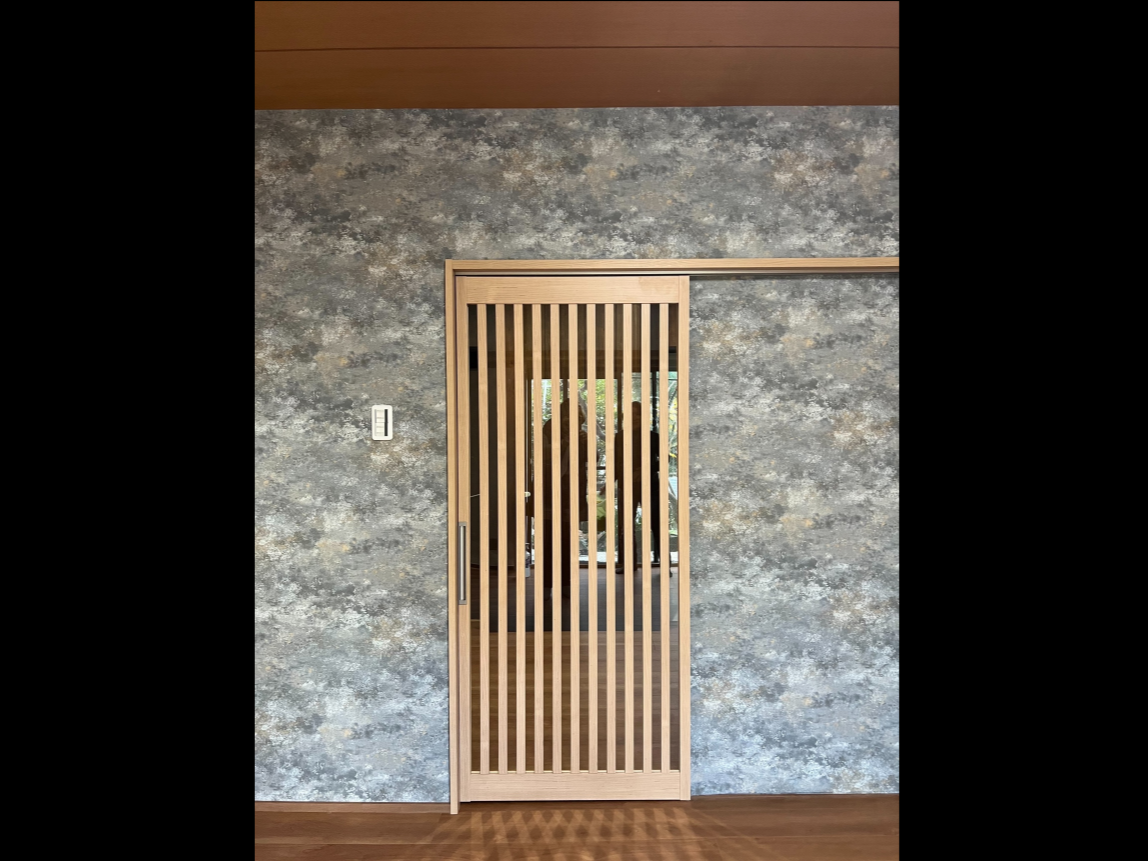 縦格子の引き戸とシックなグレーのクロスと合わせることで、モダンな和の空間を演出しました。