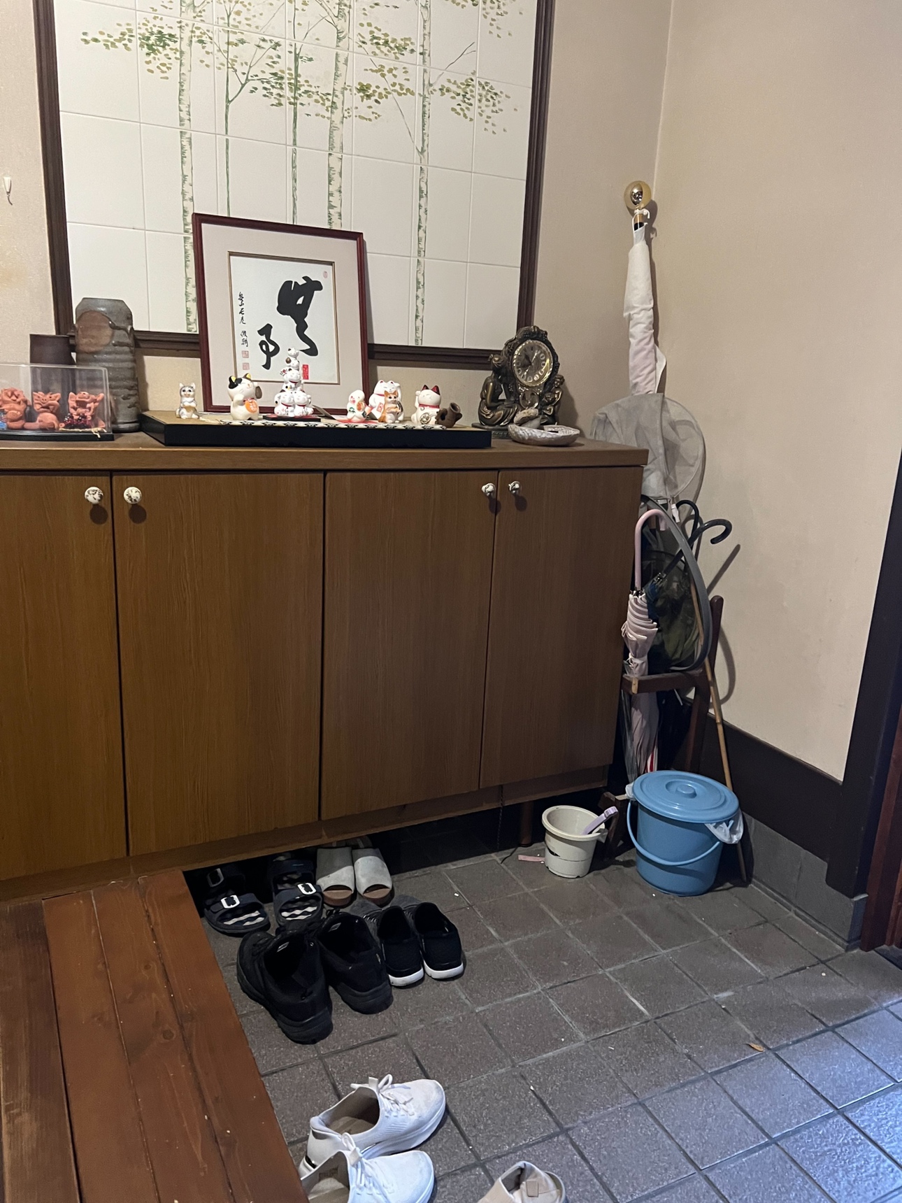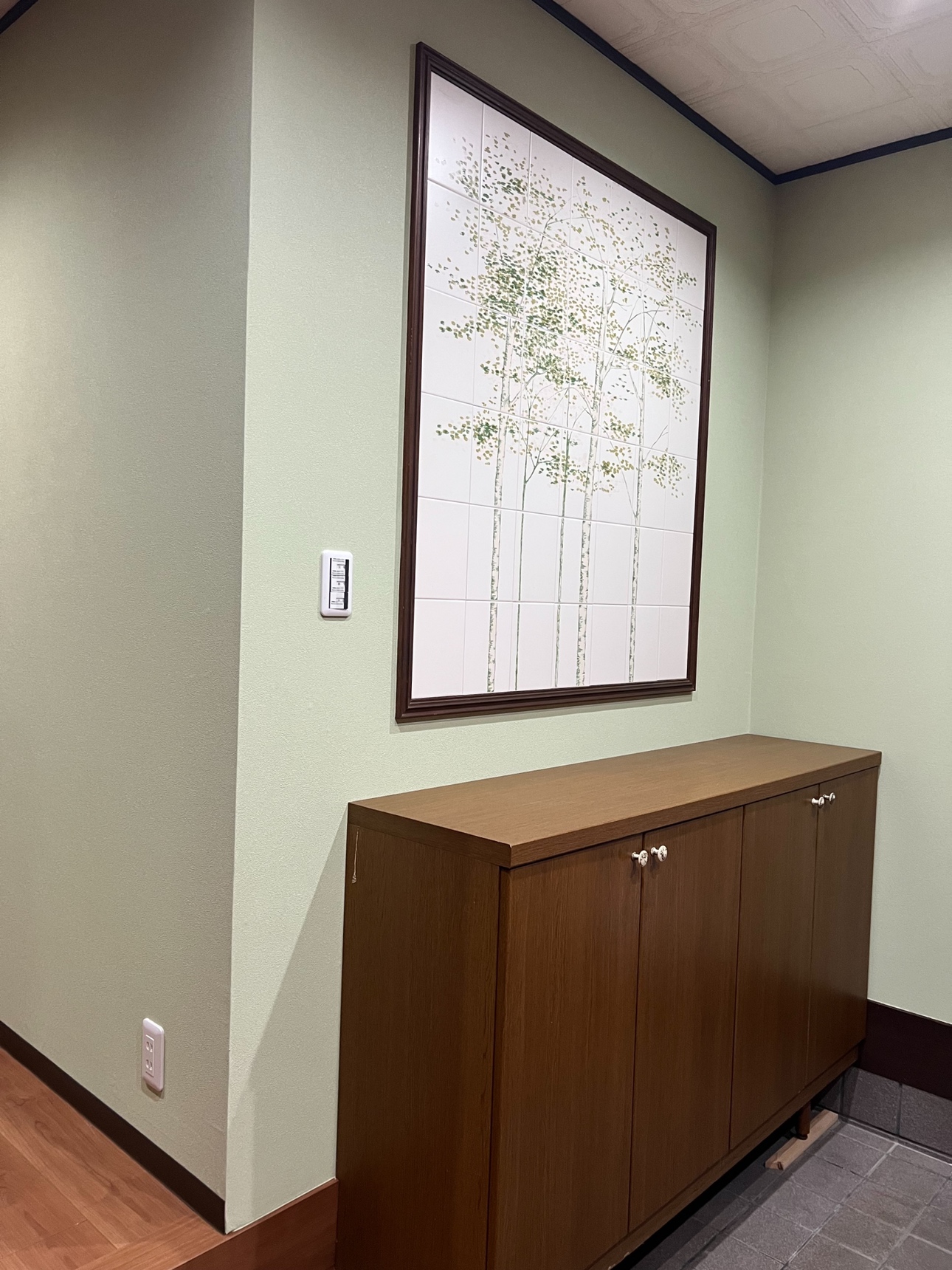 「和」の雰囲気に馴染む、落ち着いたグリーンのクロスを採用。温かみのある玄関を演出しています。